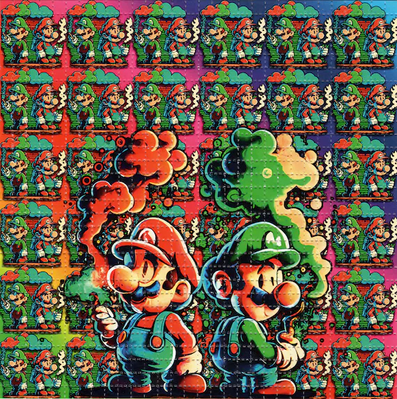Shop Mario Luigi LSD Tab blotter featuring psychedelic visuals and nostalgic artwork. Lab-tested, clean, and trip-ready.